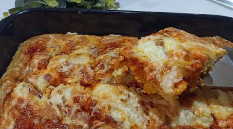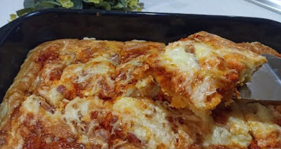 Umuti jaja sa jogurtom, uljem, brašnom, praškom za pecivo, ajvarom i začinima, sipaj u podmazan pleh, premaži dodatnim ajvarom, poređaj slaninu i pospi sirom, pa peci u rerni zagrejanoj na 200°C oko 30 minuta dok ne porumeni i zamiriše cela kuća.