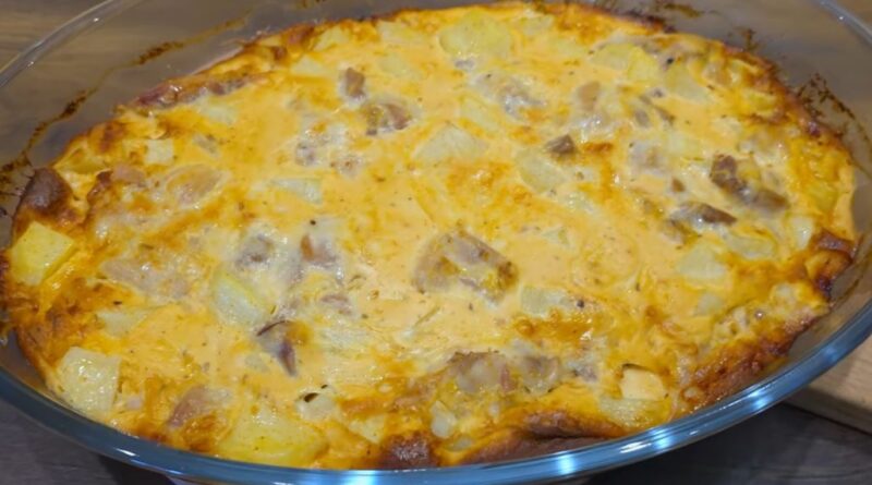 Umutite jaja sa vrhnjem, začinite, dodajte sir, piletinu i krompir, sve sjedinite, sipajte u podmazanu tepsiju i pecite 40 minuta na 200 stepeni.