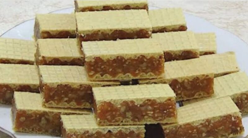 Karamelizovati šećer na umerenoj temperaturi. U karamelizovan šećer pažljivo sipati vodu, pa polako izmešati. Zatim dodati margarin i mešati na tihoj vatri dok se ne istopi. Skinuti sa šporeta, pa dodati mleveni keks, seckane orahe i susam i dobro izmešati. Smesu ostaviti da se prohladi. Na poslužavnik staviti jednu koru oblande sa hrapavom stranom okrenutom na gore i premazati prohlađenim filom. Poklopiti drugom korom sa hrapavom stranom okrenutom ka filu. Pritisnuti daskom za sečenje i ostaviti da se oblanda potpuno ohladi i da se fil stegne.