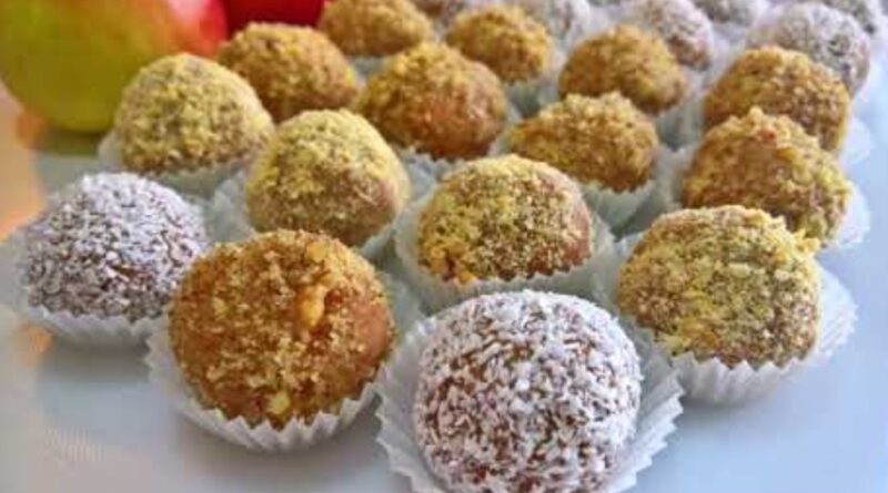 Izrendajte jabuke i kuvajte sa šećerom i vanilom, dodajte čokoladu, orahe i posni keks, oblikujte bombice i uvaljajte u orahe, kokos ili keks.