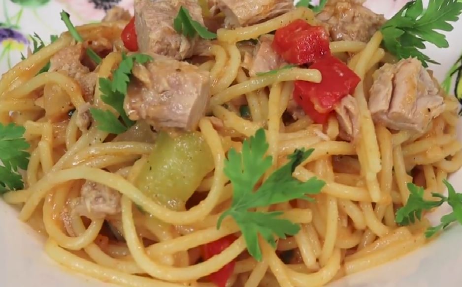 Skuvajte 500g špageta, pa na ulju propržite seckani luk, papriku i paradajz, dodajte začine (so, biber, kumin, beli luk u granulama, korijander), kašiku paradajz koncentrata i tunjevinu, promešajte sa testeninom i pospite peršunom za ukusan obrok gotov za tren.
