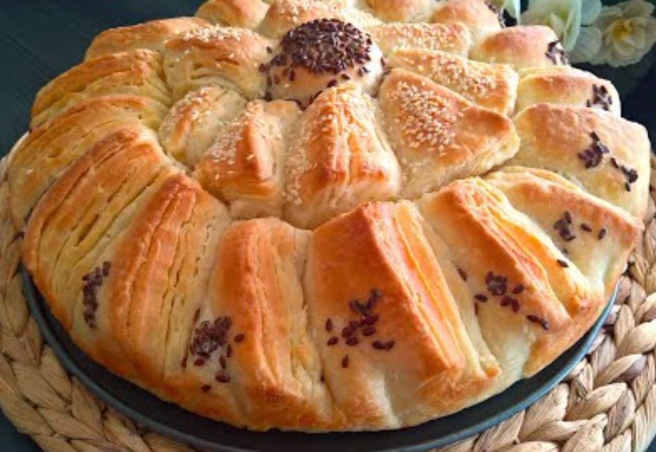 Zamesite testo od tople vode, kvasca, šećera, ulja, brašna i soli, ostavite da naraste, razvijte i premažite posnim margarinom u slojevima, oblikujte pogaču, premažite mešavinom ulja, vode i brašna, pospite semenkama i ispecite do zlatno-lisnate savršenosti.