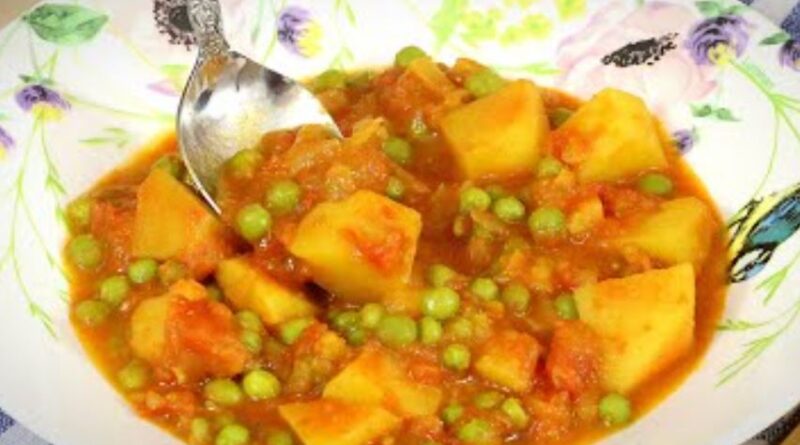 Na ulju propržite crni luk, beli i đumbir u prahu, dodajte seckani paradajz, začine (kumin, kurkuma, korijander, čili), potom dodajte krompir, grašak i vruću vodu, i kuvajte dok povrće ne omekša za lagan, posan i ukusan obrok.