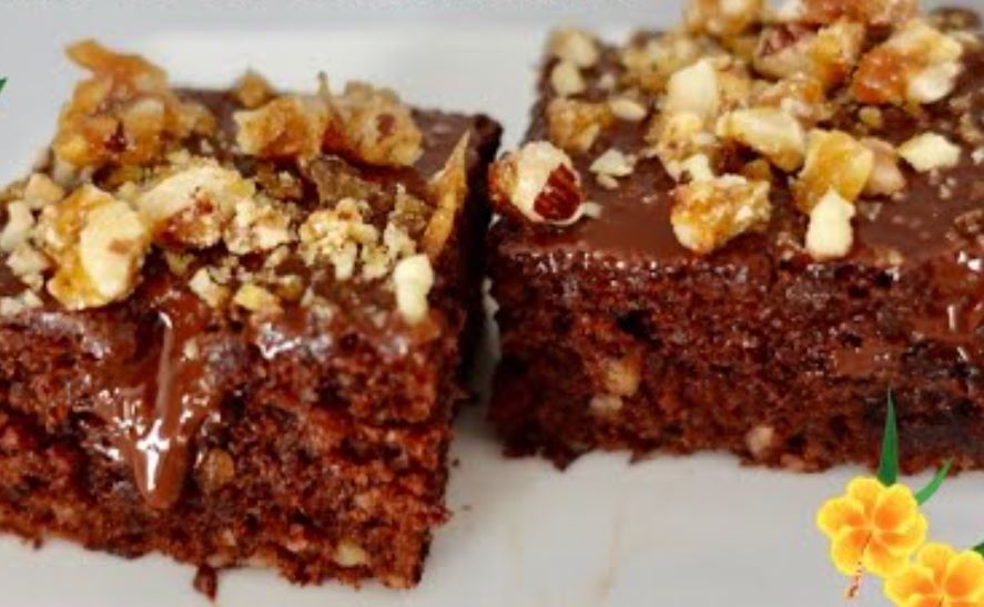 Umutite sve sastojke sa koka-kolom, pecite u kalupu, prelijte čokoladnom glazurom i pospite hrskavim grilijašem od karamelisanih oraha.