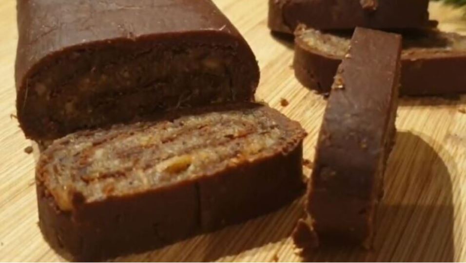 Sameljite keks, kakao, vanilu, sok i koru narandže u podlogu, a posebno izblendajte datulje, orahe, bademe i istopljeni maslac u fil, pa razvaljajte podlogu, premažite filom, uvijte u rolat i ostavite da se stegne.