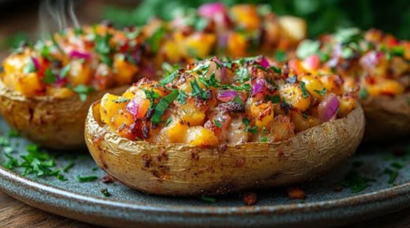 Izvadite pečene krompire, rasecite ih po sredini, pažljivo pritisnite da se otvore i napunite pečenim povrćem. Vratite u rernu još 10 minuta.