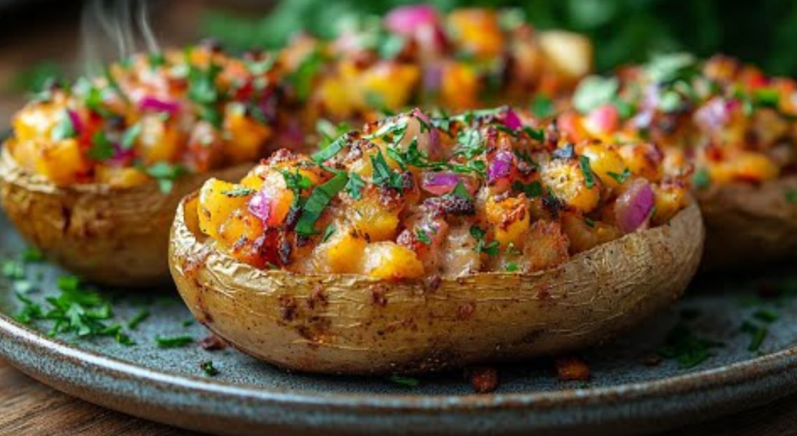 Preko punjenih krompira prelijte kremasti sos od indijskih oraha i pospite seckanim crvenim lukom i peršunom.