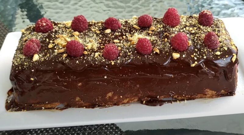 Pomešajte izdrobljenu plazmu sa jogurtom, dodajte šećer, maline i umućenu pavlaku, pa sve sipajte u kalup i prelijte otopljenom čokoladom.