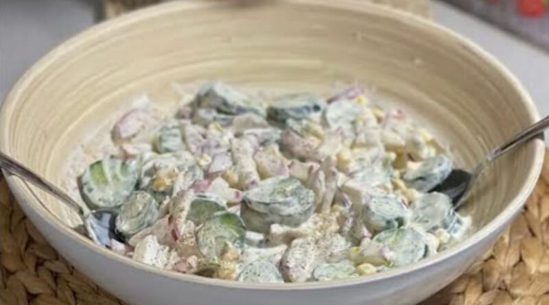 Iseckajte krastavac, rotkvice i beli luk, dodajte kukuruz, pavlaku, limunov sok, med, peršun, ulje i začine, sve dobro promešajte i odmah poslužite – ova salata će vas sigurno oduvati ukusom!