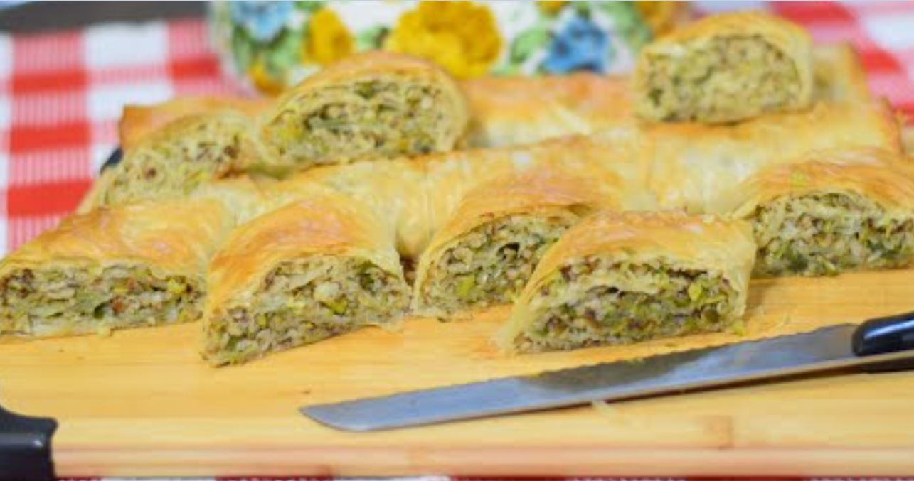 Izdinstajte seckan praziluk na malo ulja, dodajte obarenu heljdu, začine i promešajte. Filujte kore, uvijajte kao rolat ili savijenu pitu, premažite uljem i pecite na 200°C oko 30–35 minuta dok ne porumeni.