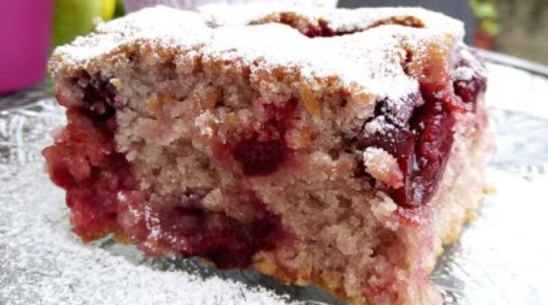 Pomešajte brašno, šećer, prašak za pecivo, sok od višanja, ulje i višnje, izlijte u pleh, ispecite i pospite šećerom u prahu