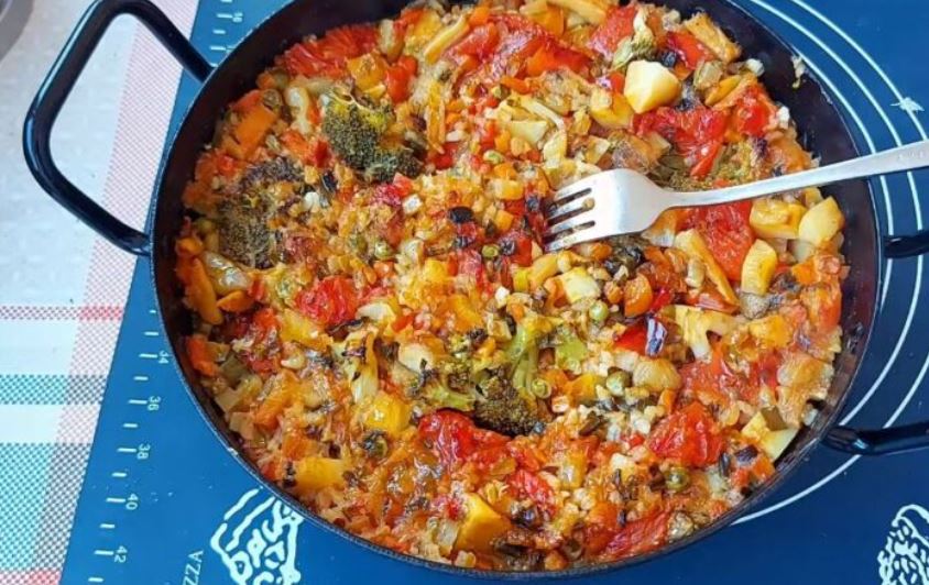 U velikoj šerpi zagrejte ulje, dinstajte mladi luk sa šargarepom, celerom i paprikama, dodajte začine i paradajz, potom pirinač, grašak i boraniju, nalijte vodu i kuvajte poklopljeno 20–25 minuta dok povrće i pirinač ne omekšaju.