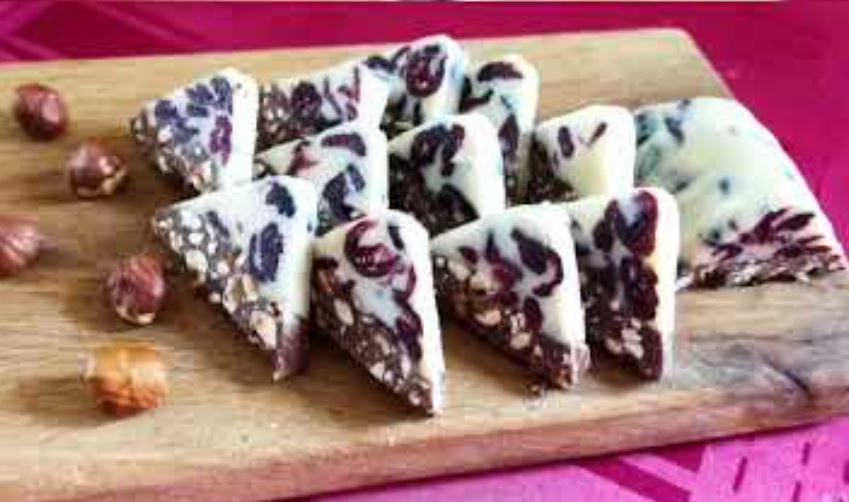 Otopiti 150g bele čokolade sa 1 kašikom meda i 20g margarina i u to dodati 100g brusnica.