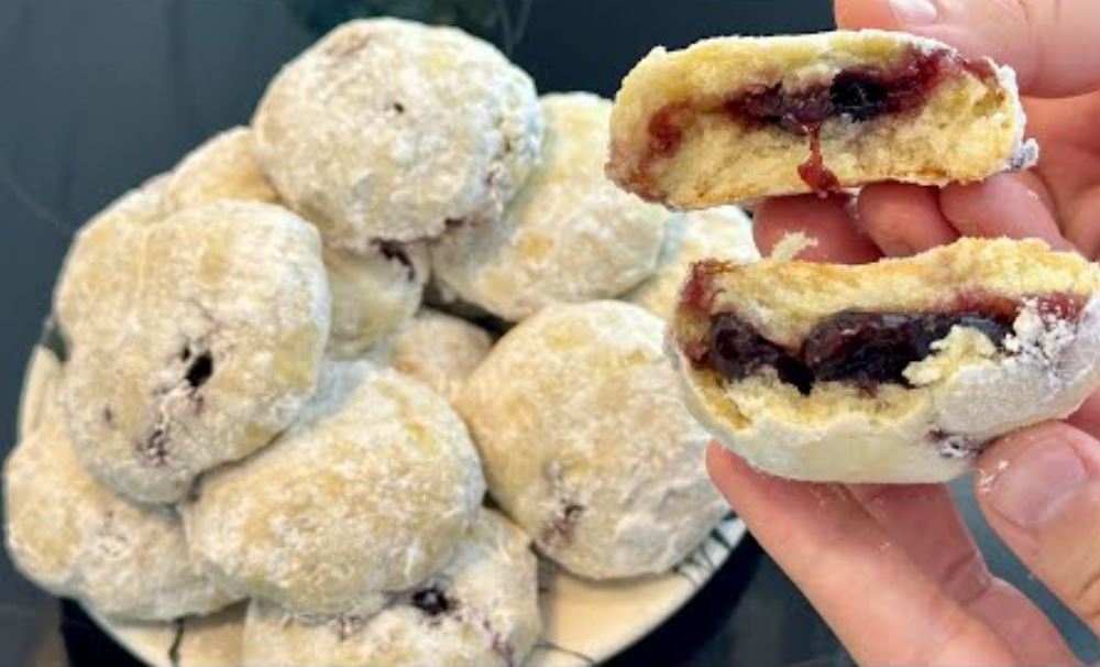 Rukama (ili dve kašike) uzimajte testo i oblikujte kuglice prečnika oko 3–4 cm. Svaku kuglicu lagano spljoštite prstima tako da dobijete disk debljine oko 0,5 cm. Na sredinu svakog diska stavite malu kašičicu džema od višanja, zatim ivice diska spojite preko džema i nežno ga stisnite da se zatvori (tako ćete dobiti keksić s džemom u sredini).