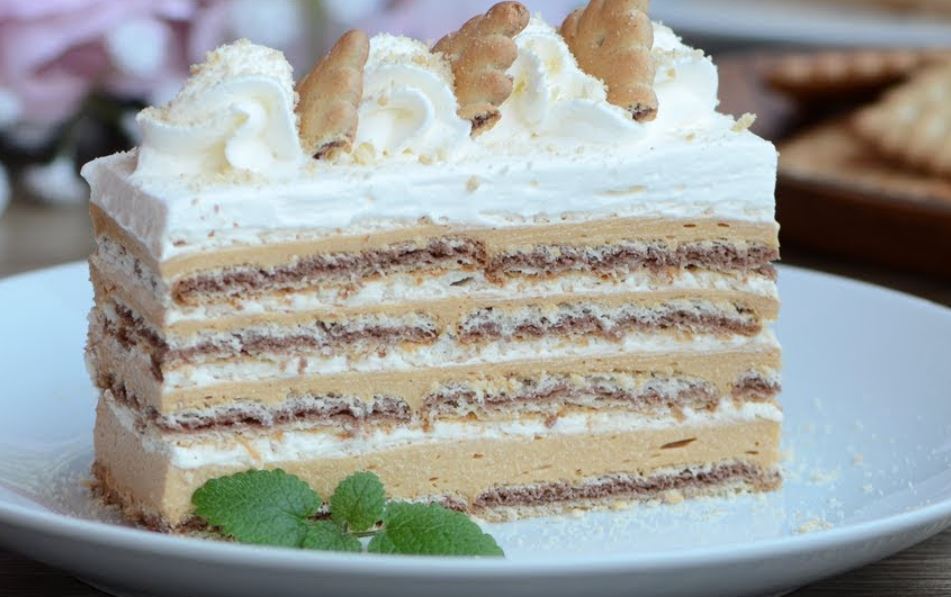 Ova šeherezada torta je dosta popularna, a opet je jednostavna za pripremu i ne peče se. Ovdje možete vidjeti da sam složila četiri reda, ukoliko želite višlju tortu možete složiti i pet redova.