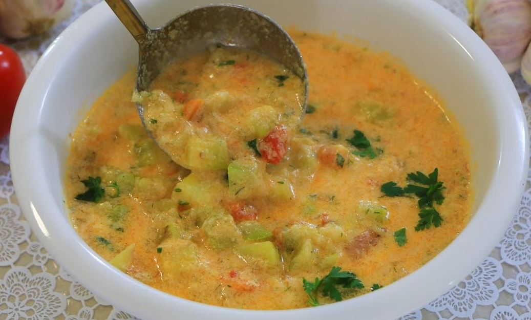 Izdinstati luk na ulju, ja dodam odmah i beli luk. Potom iseckan krompir, sargarepu, celer. Kratko dinstati i dodati iseckan paradajz i 200 ml. vode. Zatim idu iseckane tikvice, kratko dinstati, dodati jos vode. Kuvati dok sve ne omeksa pa dodati zacine i iseckanu mirodjiju i lisce. Na kraju umesati umuceno jaje sa pavlakom i brasnom. Kuvati kratko i posluziti. Prijatno!