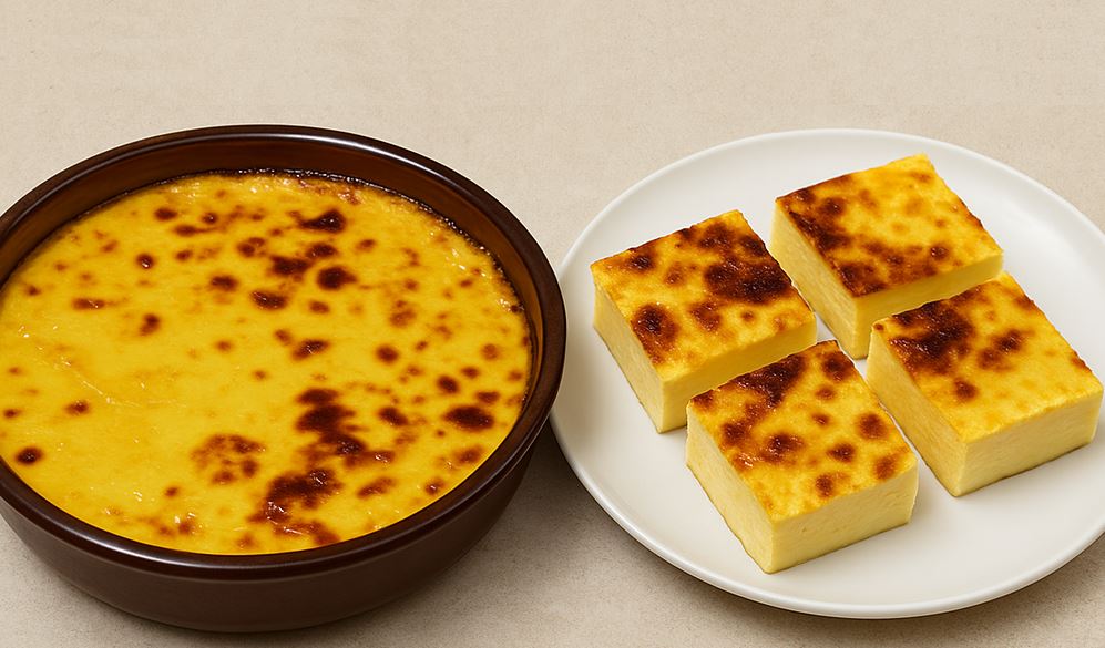 Okusom podsjeća na dalmatinsku rožatu, ali za razliku od nje, kajmačina se ne kuha u vodenoj kupki, nego peče direktno – i upravo to joj daje onu zapečenu, karameliziranu koricu.
