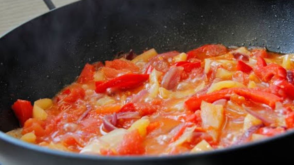 Posoliti i pobiberiti i dinstati dodatnih 10 minuta, nakon čega dodajemo i paradajz te sve zajedno dinstamo još 10 – 15 minuta