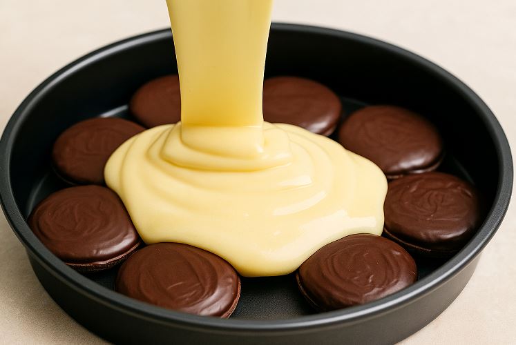 Dok se kolač peče, pripremite preliv: zagrejte pavlaku ili mleko i u njoj otopite čokoladu uz mešanje.