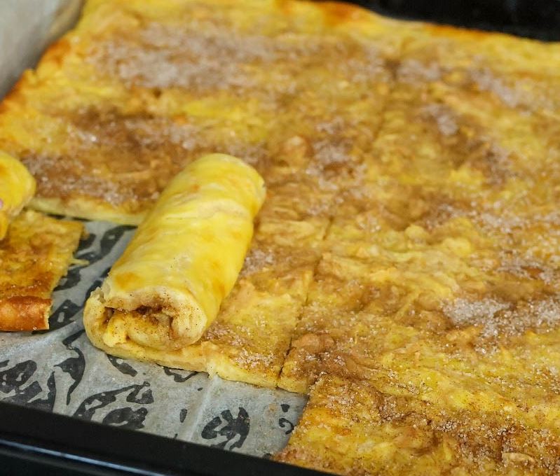 Pecite u rerni oko 30 minuta na 200 stepeni Celzijusa. Kada se ispeče, isecite na kocke, pospite sa šećerom i sa cimetom, urolajte i poslužite.