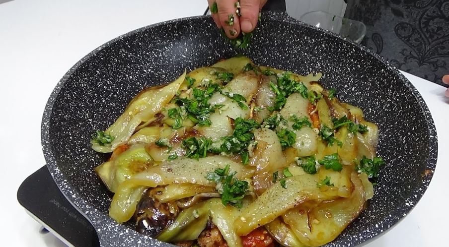 U tepsiju ili vatrostalnu činiju slažite red paradajz sosa preprženog sa lukom, pa red patlidžana, red paprika, red peršuna, red kobasica i slažite dok ne istrošite materijal, a zatim prelijte sa paradajz sosom i ostavite 10 minuta da se ukrčka.