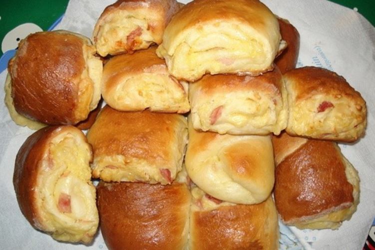 U međuvremenu mikserom izmutiti fil. Svaku četvrtinu tijesta dobro razvaljati i namazati filom te preko njega posuti narendanom šunkom i sirom.
