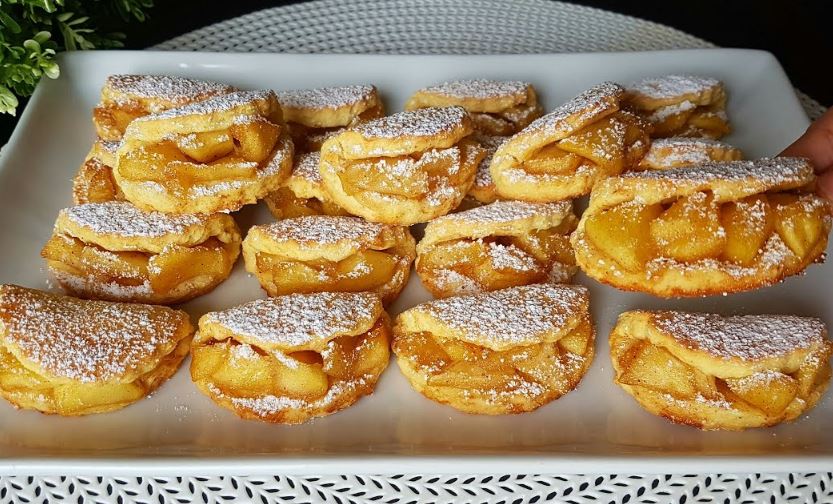 Lagano sipajte prašak za pecivo i brašno, pa mešajte dok ne dobijete glatko testo, koje ćete potom zamesiti rukama. Razvucite što tanje oklagijom, pa okruglom modlom ili čašom vadite krugove kao za krofne. Svaki od njih napunite sa kašičicom nadeva od jabuke, pa ih lagano preklopite, ali nemojte skroz zatvarati.