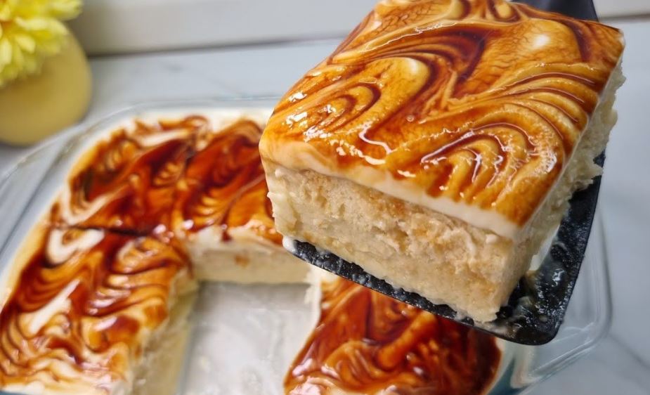 Kada proključa prelijte preko hleba. Stavite da se hladi u frižideru dok pripremate naredni sloj. Sirni namaz, kondenzovano mleko i 50 ml mleka umutite u blenderu. Prelijte preko prethodnog sloja. Stavite u frižider na 3 sata da se dobro stegne. Pre sečenja ukrasite karamelom.