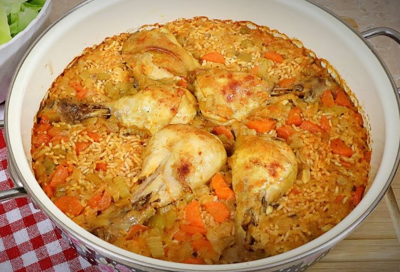 Pirinac sa piletinom iz rerne recept za brzi rucak ili veceru jednostavan za pripremu riza sa pilecim mesom koju ce i deca rado jesti. Sargarepa, celer, pirinac, crni luk, beli luk i kokosija kocka za supu i zacini ucinice ovo jelo ukusnim i neodoljivim.