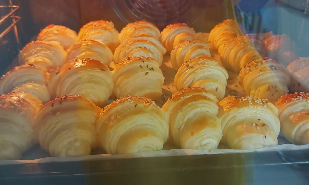 Kašičicom vaditi i puniti trouglove i uvijati u kiflu. Ostaviti u plehu 30 min pokrivene, premazati žumancetom i posuti susamom pa peći na 200 stepeni C 30 min. a zatim pokriti krpom 15 min .