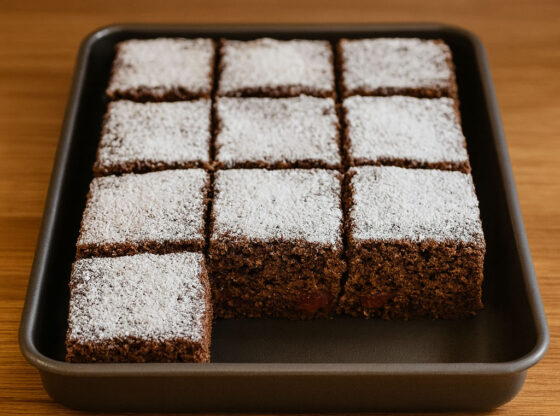 Ohlađen kolač posuti prah šećerom i seći na kocke ili trouglove.