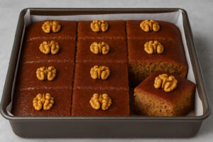 Kada izvadite kolač iz rerne, odmah ga prelijte toplim sirupom. Ostavite da upije i potpuno se ohladi.