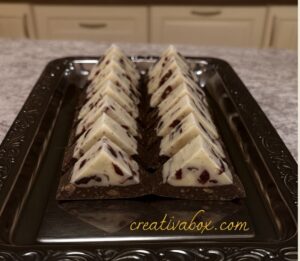 Toblerone trouglovi sa brusnicom su elegantan, bogat i aromatičan kolač koji kombinuje tamnu i belu čokoladu, orahe i sušenu brusnicu. Idealni su za praznike, slavlja ili kao desert koji se topi u ustima. Ovaj jednostavan recept ne zahteva pečenje, a ukus je čista čokoladna magija!