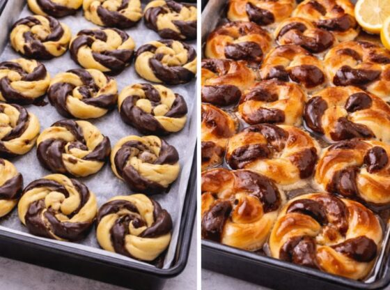 Oblikuj kolač: Oba testa razvući u trake ili pravougaonike, složi jedno preko drugog, pa urolaj/uvij kao puž ili blago upleti (kako god ti je najlakše). Prebaci u podmazan pleh ili obložen papirom.