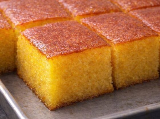 Izlijte u podmazan pleh i pecite na 200 stepeni dok kolač ne dobije zlatnu boju.