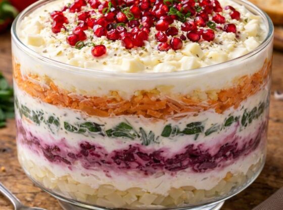 Ako ti treba salata koja izgleda raskošno, a pravi se jednostavno, ova slojevita salata sa krompirom, cveklom i narom je pun pogodak. Slojevi povrća, jaja i kremastog belog fila prave savršen balans ukusa i teksture, dok zrna nara daju blagu kiselkastu svežinu i prelep dekorativni efekat.