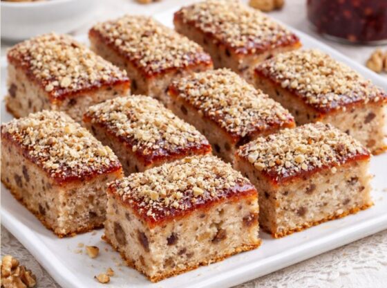 Dok je kolač još topao, premažite ga marmeladom i pospite mlevenim ili seckanim orasima.