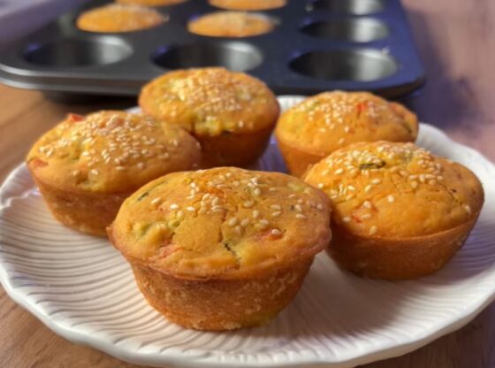 Pomešajte tečne i suve sastojke, dodajte povrće i ajvar, sipajte smesu u kalupe za projice, pospite susamom i pecite dok ne porumene.
