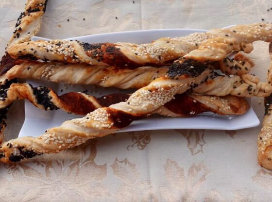 Od gotovog testa odvajajte manje komade i oblikujte tanke štapiće željene dužine. Poređajte ih na pleh obložen papirom za pečenje. Svaki štapić premažite posnim margarinom, pa pospite susamom, makom ili crvenom alevom paprikom, u zavisnosti od toga koji ukus više volite.