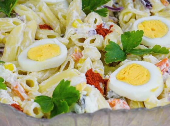 Prema uputstvu sa pakovanja, skuvajte testeninu pa je isperite u hladnoj vodi i ocedite. Sitno naseckajte povrće pa promešajte sve sastojke zajedno sa testeninom. Zalijte sve jogurtom pa narendajte sir i promešajte kako bi se svi sasojci lepo sjedinili. Izgnječite beli luk pa ga dodajte u salatu. Posolite po ukusu pa dodajte skuvana jaja i sve promešajte. Dekorišite peršunom, slatkom začinskom paprikom i jajima pa ostavite u frižider da se dobro ohladi.