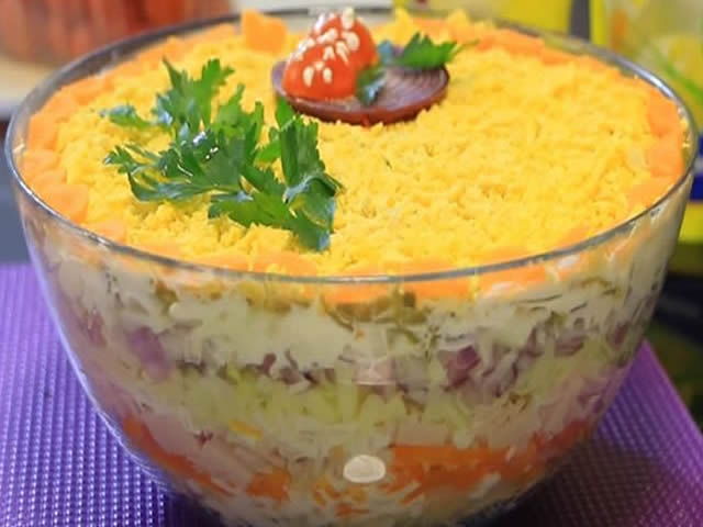izvor:serpica.net Sastojci i priprema: 4 srednja krompira, 400 – 500 gr. šargarepe, 6 – 7 kiselih krastavaca, 6 jaja, 1 glavica ljubičastog luka (može i…
