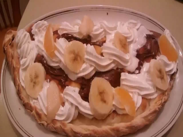 Testo za tri pizze: 300gr brašno, prsohvat soli, 2kašike šećera,50gr margarin, 150ml mleka. Nutela krem 300 gr, 100 gr plazme, 3 banane, 1 kruška, 2…