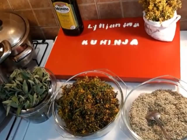 izvor:Ljiljanina kuhinja Potreban materijal : -2lit maslinovog ulja – 100gr sveze zalfije -100gr suve hajducke trave moze i sveza -cvetova kantariona sto vise vam moze…