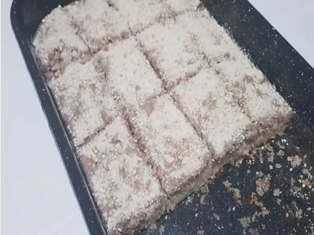 Sastojci: 3 jaja, 3 šoljice šećera, 3 šoljice brašna, 3 šoljice mlevenog keksa, 2 šoljice ulja, 1 prašak za pecivo, 1 šoljica suvog grožđa, 250g…