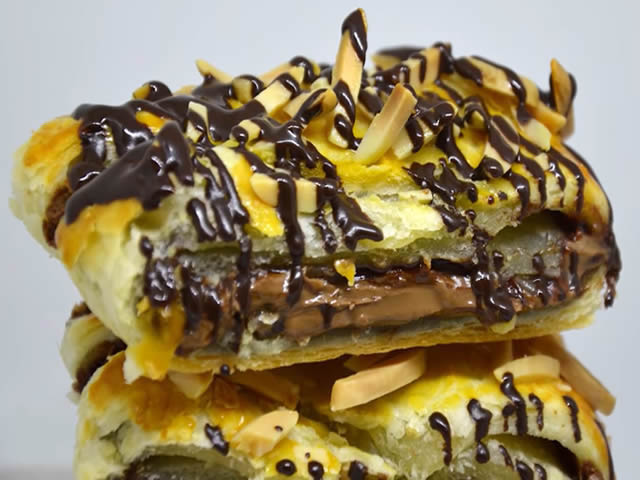 Čokolada u lisnatom tijestu (VIDEO) SASTOJCI: 250 gr (jedna kocka) lisnatog tijesta, 100 gr cijele čokolade, 1 žumanjak, guljeni i sjeckani bademi za posipati po…