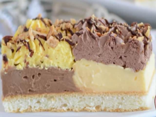 izvor:Natašine Slastice SASTOJCI: BISKVIT: 8 bjelanjaka 8 žlica šećera 8 žlica brašna KREMA1: 8 žumanjaka 180 gr šećera 2 pudinga od vanilije 3 žlice gustina…