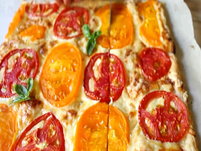 Sastojci: 200g odmrznutog lisnatog testa, 2 veća paradajza, 2 pune kašike krem sira, 2 kašike parmezana, 2 čena belog luka, nekoliko listova bosiljka, 2 kašike…