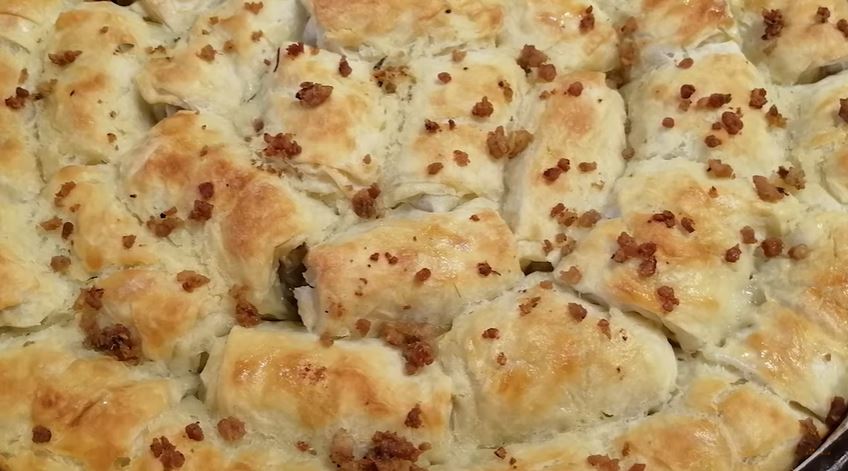slika: Domaći Kuhar Sastojci za tijesto: 1 kg brašna, 1 kašikica soli, vode po potrebi Sastojci za fil: 1/2 kg pilećeg filea, 1 veća glavica luka,…