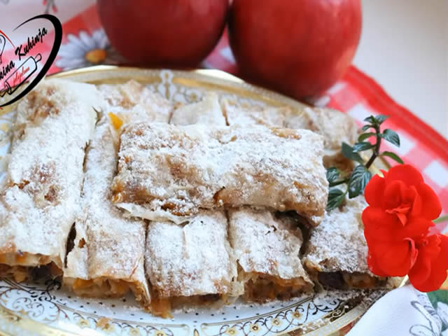 Potrebno je: 6-8 tankih kora 100 gr seckanih oraha 200 gr šećera 300 gr duleka 1 veća jabuka cimeta ulje Detalje pripreme pogledajte u videu.…