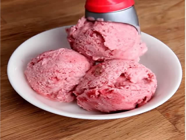 Sastojci: 3 šolje zamrznute jagode, 3 zamrznute banane, 1 šolja grčkog jogurta i iseckane sveže jagode.